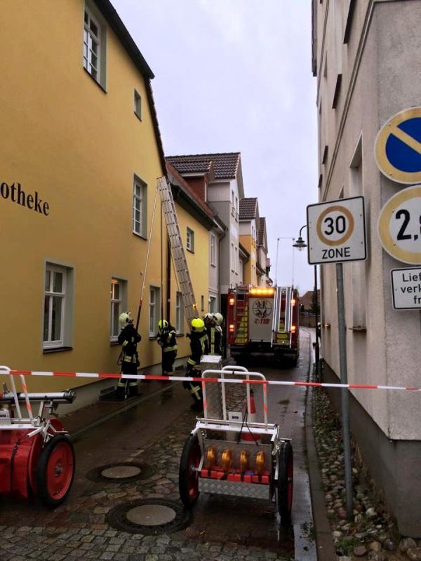 Aufgrund des neuerlichen Orkantief "Felix" hatten sich Dachziegel bei einem Wohn-und Geschäftshaus Am Markt, Ecke Pfarrstraße gelöst und sind in der Folge auf die Straße gestürzt. Die Kameraden sind von der Schiebleiter aus aufs Dach und haben die losen Dachziegel eingeschoben und erst einmal das Dach provisorisch dicht gemacht.