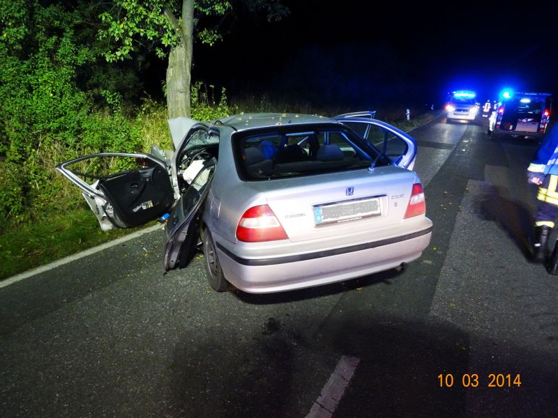 Ein 26 Jahre alter Autofahrer ist in den frühen Morgenstunden des heutigen Tages der Deutschen Einheit in Schwaan mit seinem Auto verunglückt. Der Verkehrsunfall ereignete sich gegen 1 Uhr am Ortsausgang von Schwaan auf der Vorbecker Chaussee. Aus bislang noch ungeklärter Ursache kam der junge Autofahrer laut Aussagen der Polizei mit seinem Honda auf gerader Strecke nach links von der Straße ab und raste frontal gegen einen Baum. Wie die Beamten mitteilten, soll der 26-Jährige nicht angeschnallt und zudem stark betrunken unterwegs gewesen sein. Ein genauer Alkoholwert muß noch ermittelt werden. Der junge Fahrer wurde in seinem Auto bei dem Crash eingeklemmt und mußte von den Kameraden der Freiwilligen Feuerwehr mit schwerer Technik herausgeschnitten werden. Der 26-Jährige erlitt nach erstem Anschein glücklicherweise nur leichtere Verletzungen. Er kam nach Rostock in die Südstadtklinik. Zu ermitteln ist auch noch, ob weitere Mitfahrer in dem Wagen saßen und sich nach dem Unfall entfernten oder herausgeschleudert wurden. Die Feuerwehrleute suchten mit einer Wärmebildkamera die nähere Umgebung nach Personen ab, wurden aber nicht fündig. Die Straße blieb zeitweise voll gesperrt.