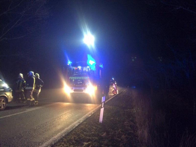 Bei unserem Eintreffen an der Einsatzstelle waren die beiden Insassen aus dem verunfallten Fahrzeug durch Ersthelfer befreit worden. Wir sicherten die Einsatzstelle, leuchteten sie aus und stellten die Löschbereitschaft her.