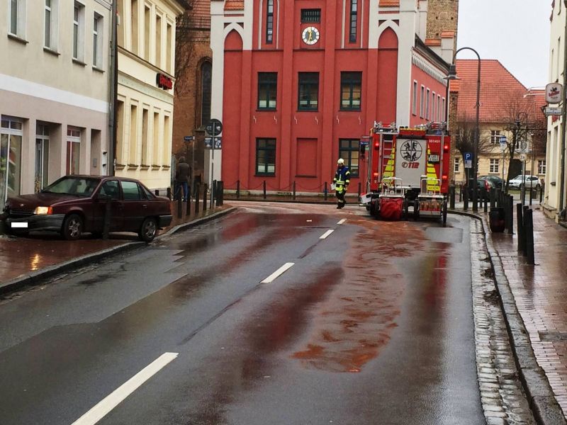 Hilfeleistung Klein; Schwaan; Bahnhofstraße Richtung Pferdemarkt, Ölspur am 22.12.2015 um 12:23 Uhr