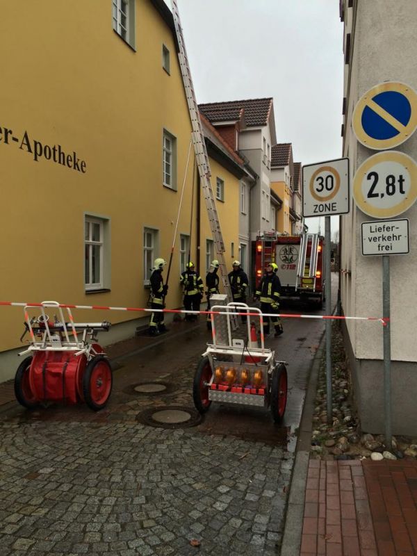 Aufgrund des neuerlichen Orkantief "Felix" hatten sich Dachziegel bei einem Wohn-und Geschäftshaus Am Markt, Ecke Pfarrstraße gelöst und sind in der Folge auf die Straße gestürzt. Die Kameraden sind von der Schiebleiter aus aufs Dach und haben die losen Dachziegel eingeschoben und erst einmal das Dach provisorisch dicht gemacht.