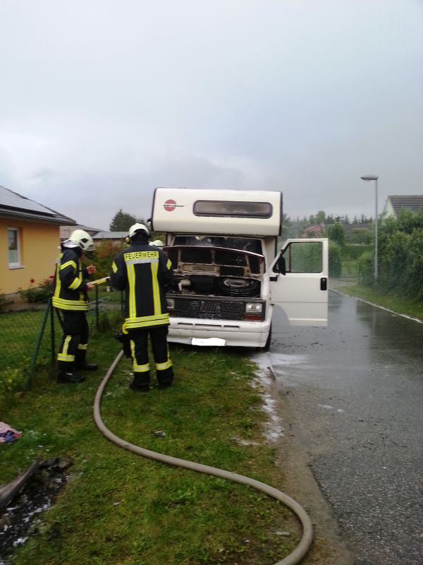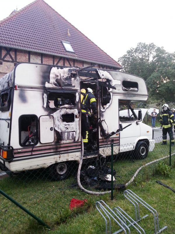 Beim Eintreffen unseres Löschzuges hatte die FF Benitz bereits mit einem C-Rohr einen Außenangriff durchgeführt und den offenen Flammenbrand unter Kontrolle gebracht. Der Angriffstrupp des HLF 20/16 hat dann im Anschluß noch eine Restablöschung im Innern des Wohnmobils unter Pressluftatmer und Zuhilfenahme der Wärmebildkamera durchgeführt.